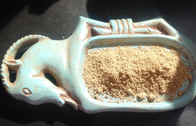 Ainsi, bien que je l’aie également fait en parfum huileux parfumé aux huiles essentielles, n’attendez pas du vrai parfum de Cléopâtre qu’il soit liquide ! C’est en réalité une poudre qu’on frottait sur son corps, comme l’étaient les meilleurs parfums, ceux qui avaient toutes chances de sentir un peu plus durablement que les huiles, comme j’ai pu le tester après l’avoir recréé !