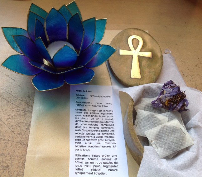 • A la Une, le coffret kyphi lotus d’exception comprend un photophore en forme de lotus formé de coquillages, 10 pastilles de kyphi de lotus et une fleur de lotus bleu, symbole de la Haute-Egypte dans une boîte Ankh, symbole de vie des anciens Egyptiens qu’on voyait dans la main des dieux représentés sur les fresques. La fleur de lotus, outre sa beauté, est un sédatif doux et un aphrodisiaque employés dans l’Antiquité jusque chez les Romains !
