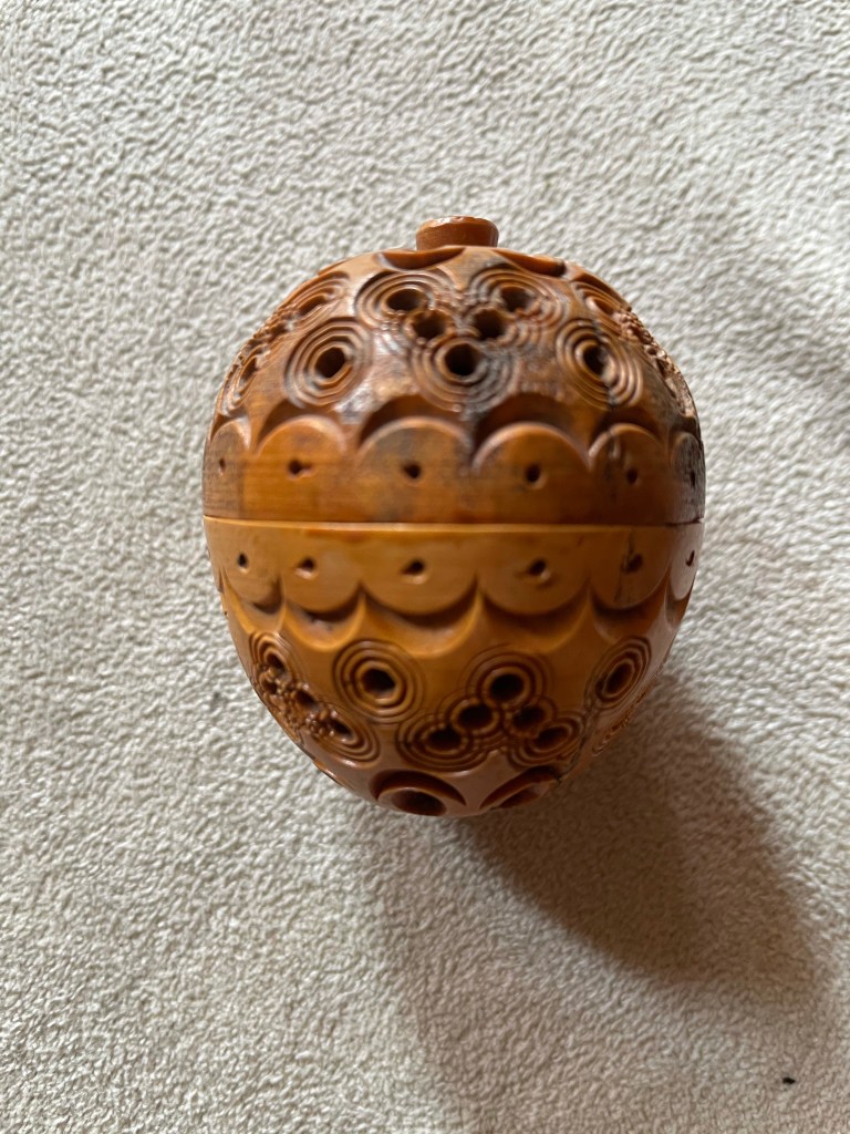 Du pomander, qui fut surtout et qui demeure un bijou – un ornement qu’on peut encore rencontrer dans des ventes d’antiquités – on connaît surtout l’aspect visuel. Tomber sur des pomander lors d’une recherche en ligne, sur Pinterest ou autre, nous permet de rencontrer des objets historiques d’une très grande beauté parfois, et d’une grande originalité.