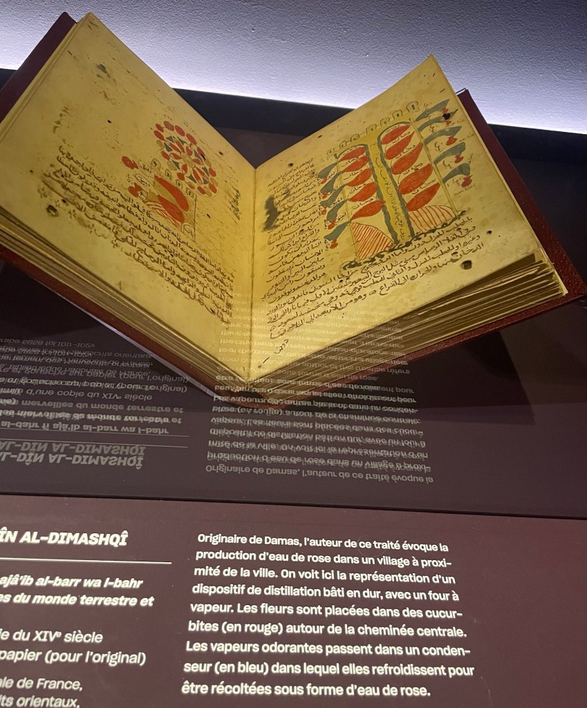 Du manuel historique qui détaille le procédé de distillation pour faire l’eau de rose au flacon qui les conserve en passant par l’appareil de distillation reconstitué, c’est le monde des procédés et du matériel de la parfumerie ancienne qui s’expose ainsi. Du moins, légèrement…