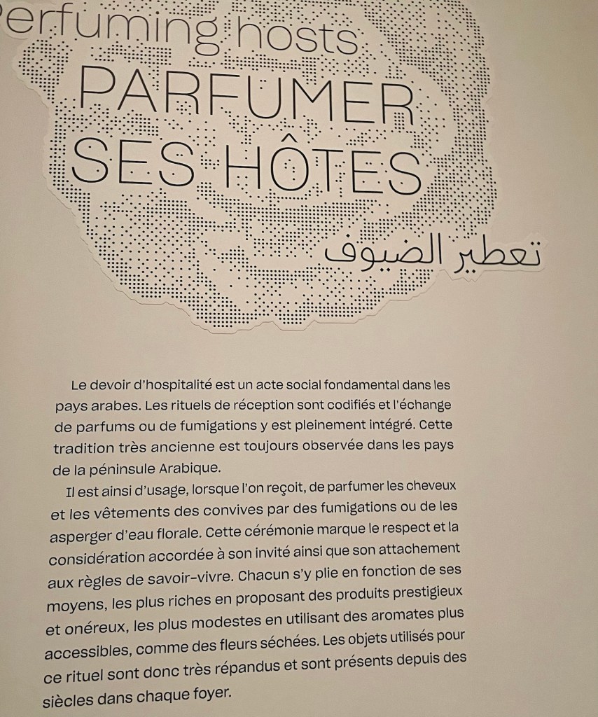 Au milieu d’une très belle collection d’objets anciens et de spécimens de matières premières à parfum, l’exposition présente au visiteur la culture spécifique associée à l’idée de parfum dans les pays arabes. Pourquoi ? Parce qu’elle est unique !