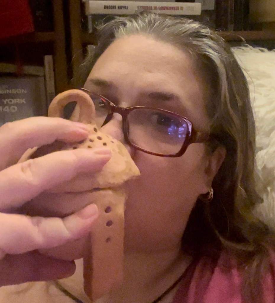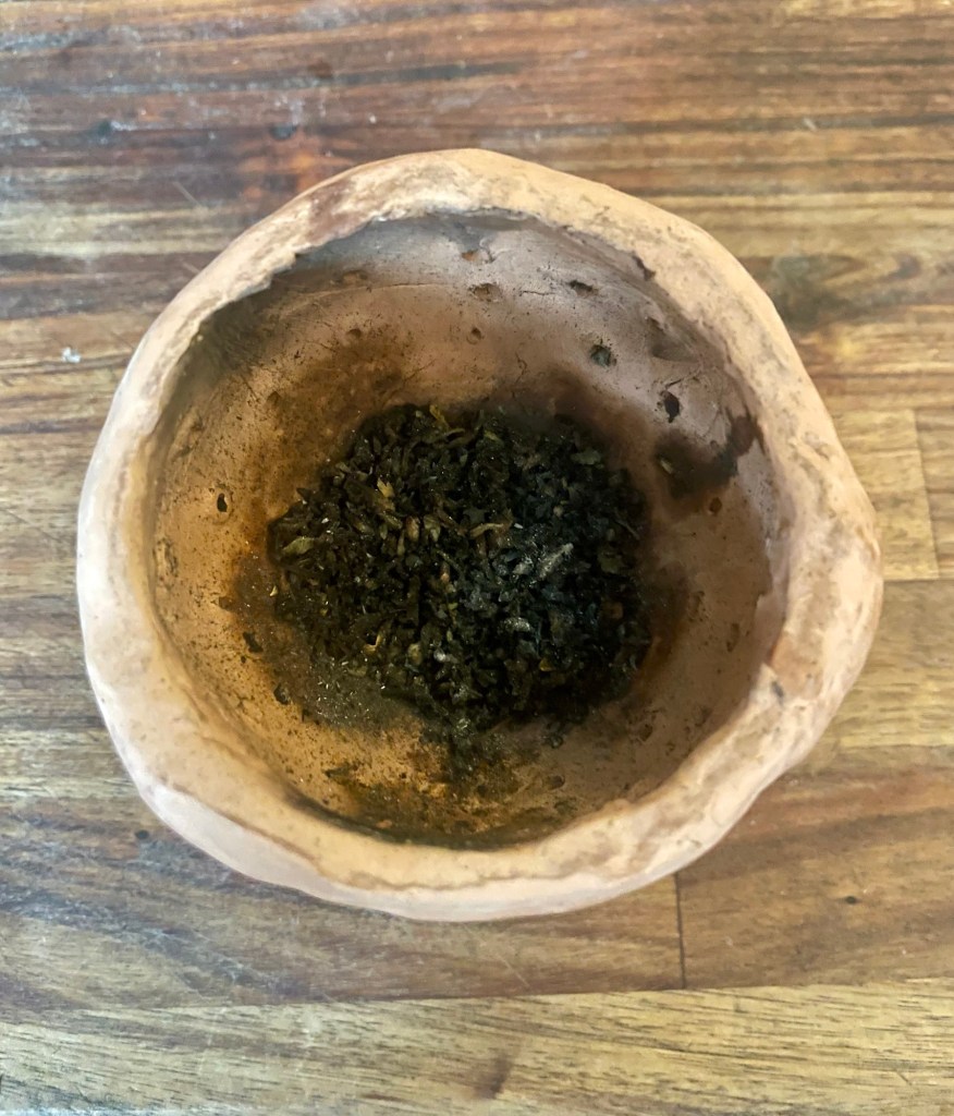 Pour plus de commodité, je la tiens entre mes mains, ma bouche collée aux trous du brûleur et je souffle pour faire prendre le feu de l’intérieur, comme ça semble prévu. Je comprends vite que comme avec un soufflet, il ne faut pas s’arrêter au risque de voir le faible feu s’éteindre rapidement. Je passe donc mon temps à souffler dans les trous et inspirer pour reprendre mon souffle. Mais dès lors que je souffle sur les herbes, la fumée s’échappe et c’est elle que j’inspire à chaque fois, si bien que je finis par en ressentir les effets…