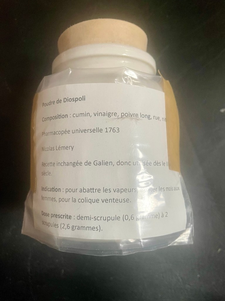 - Poudre de Diospoli. 1763. Pharmacopée universelle de Lemery mais recette de Galien. « Pour abattre les vapeurs, les coliques venteuses et susciter les mois aux femmes.