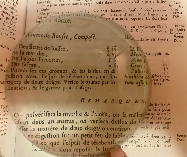Une fois ceci posé, je coche les recettes qui sont réalisables selon ce cahier des charges et je les laisse infuser dans mon esprit pendant des mois. Car qui dit médicament ancien dit arrière-plan très riche de culture implicite à laquelle nous n’avons plus accès : théories médicales anciennes et toutes relatives à leur époque, procédés, gestes, croyances qui nous sont complètement étrangers. Il faut aussi s’habituer aux exigences des étapes, si on les a bien comprises et si on peut les suivre. Enfin, le dernier point et pas des moindres est celui des poids et mesures anciens qu’il faut transposer, voire conserver en l’état pour obtenir une information de plus.