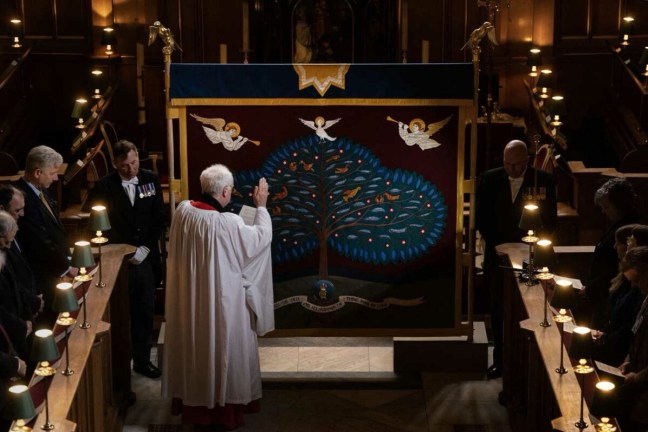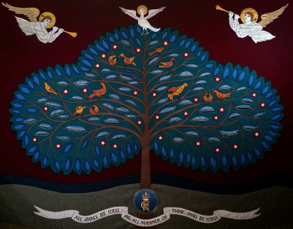 Et pour cause ! Tandis que l’événement était rapporté intégralement à la télé, le moment considéré le plus sacré, l’onction, était caché des écrans par une tenture aux motifs symboliques et intégralement conçue pour ce moment.
